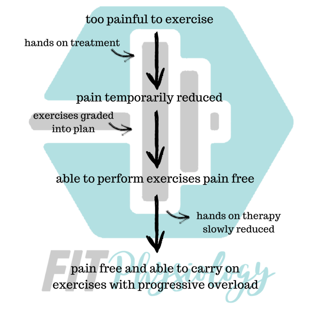 Soft Tissue Therapy is similar to Physiotherapy in that it deals with the muscles, however, it has a more hands on approach and implements massage and tissue release techniques to decrease pain in the short term. In a randomized trial of 49 patients with lower back pain over the period of 12 months, the findings were that the group receiving two 45-minute treatments alongside exercise were twice as effective at decreasing pain as the group only performing exercises.4 A good Soft Tissue Therapist will also have knowledge on exercise prescription and be able to introduce exercises in the right amount at the right time, so the journey will look more like this: